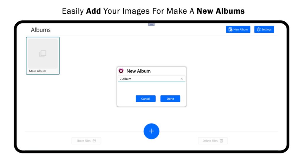 - After creating the album, click on the ‘Add to Album’ button, then select media files from your storage. This feature allows you to securely save a variety of media and documents within the album.